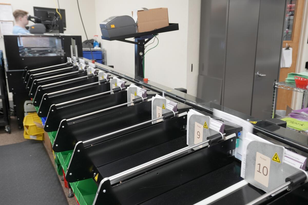 Vote by mail envelopes are sorted at the Shasta County Registrar of Voters office in Redding in February. The Shasta County Board of Supervisors last year voted to get rid of the county’s ballot-counting machines and had planned to conduct elections with a hand count. The California Legislature later passed a law to bar hand-counting elections ballots, except in narrow circumstances. (Rich Pedroncelli / Associated Press)