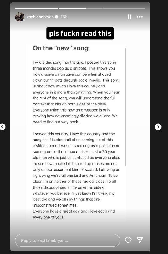 Zach Bryan's response to the backlash over his new song.